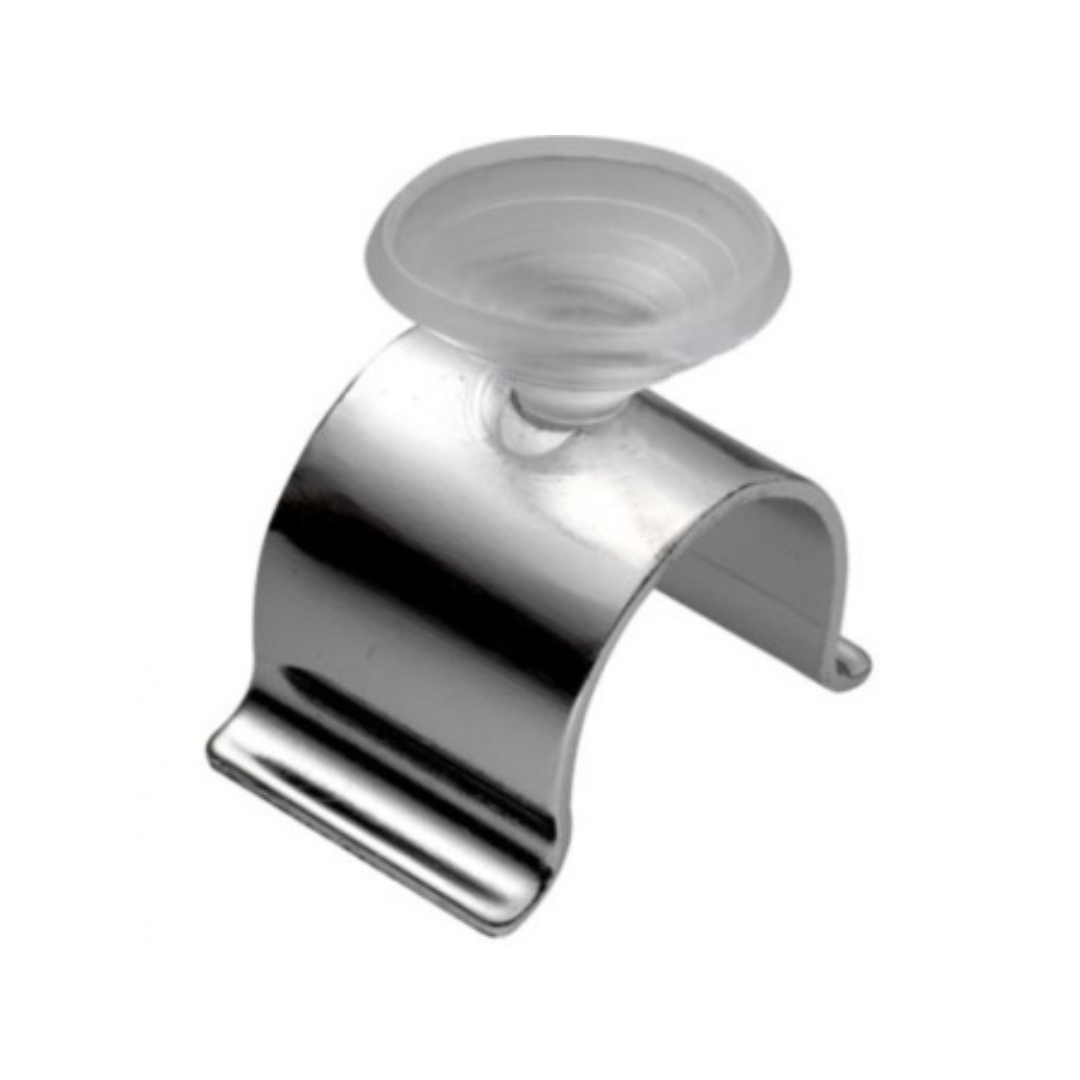 R19 А Держатель стеклянной полки - крепежный элемент торговый системы Джокер, предназначенный для установки полок из стекла. Хомут надевается на трубу 25 мм, а сверху устанавливается полка и фиксируется посредством присоски держателя.