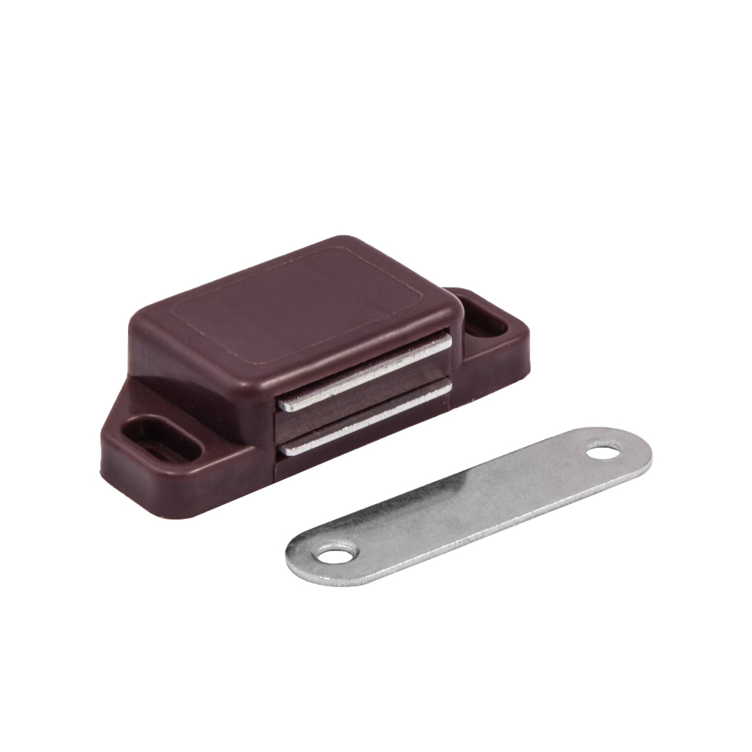 Защелка магнитная коричневая - приспособление, необходимое для предотвращения случайного открытия дверцы фасада. Магнитный фиксатор устанавливается на корпус мебели, а к внутренней стороне створки прикрепляется металлическая планка. Таким образом, дверца удерживается в закрытом состоянии за счет магнитного поля.