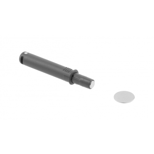 Выталкиватель AM-OWM короткий с магнитным окончанием, графит - приспособление для открытия створки фасада или выдвижения ящика без использования мебельной ручки. Вы нажимаете на дверцу шкафа или лицевую сторону ящика, и срабатывает система Push to open. Благодаря магнитному окончанию цилиндра-демпфера, осуществляется дополнительная фиксация дверцы или ящика в закрытом состоянии. Выталкиватель устанавливается посредством врезки в торец корпуса мебельной конструкции.