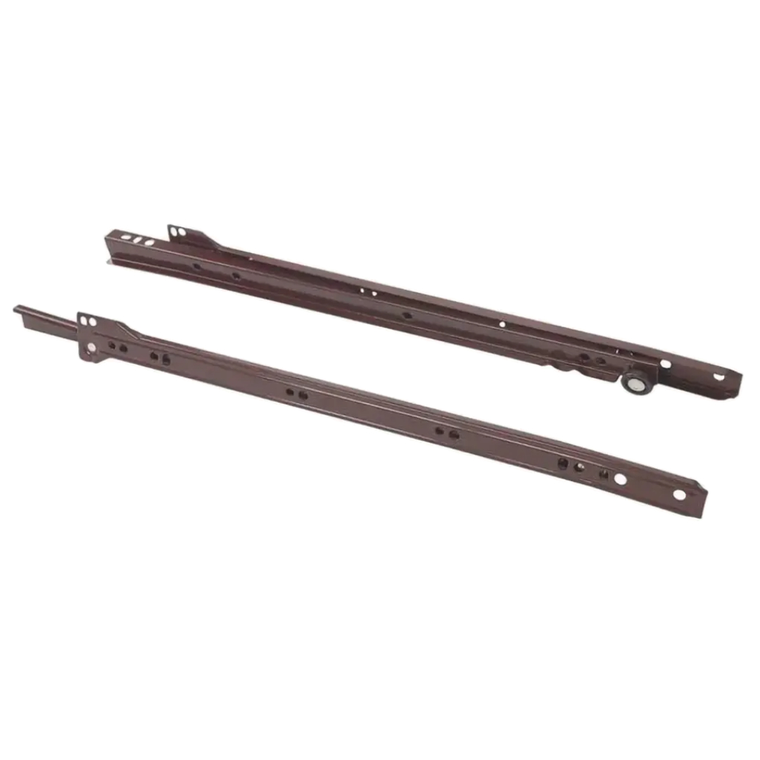 Роликовые направляющие 0,9х500 мм, коричневые - механизм неполного выдвижения для мебельных ящиков, отличающийся простотой конструкции. Роликовые направляющие подходят для бюджетной мебели, когда важны минимальные затраты на фурнитуру и не требуется расширенный функционал системы выдвижения.