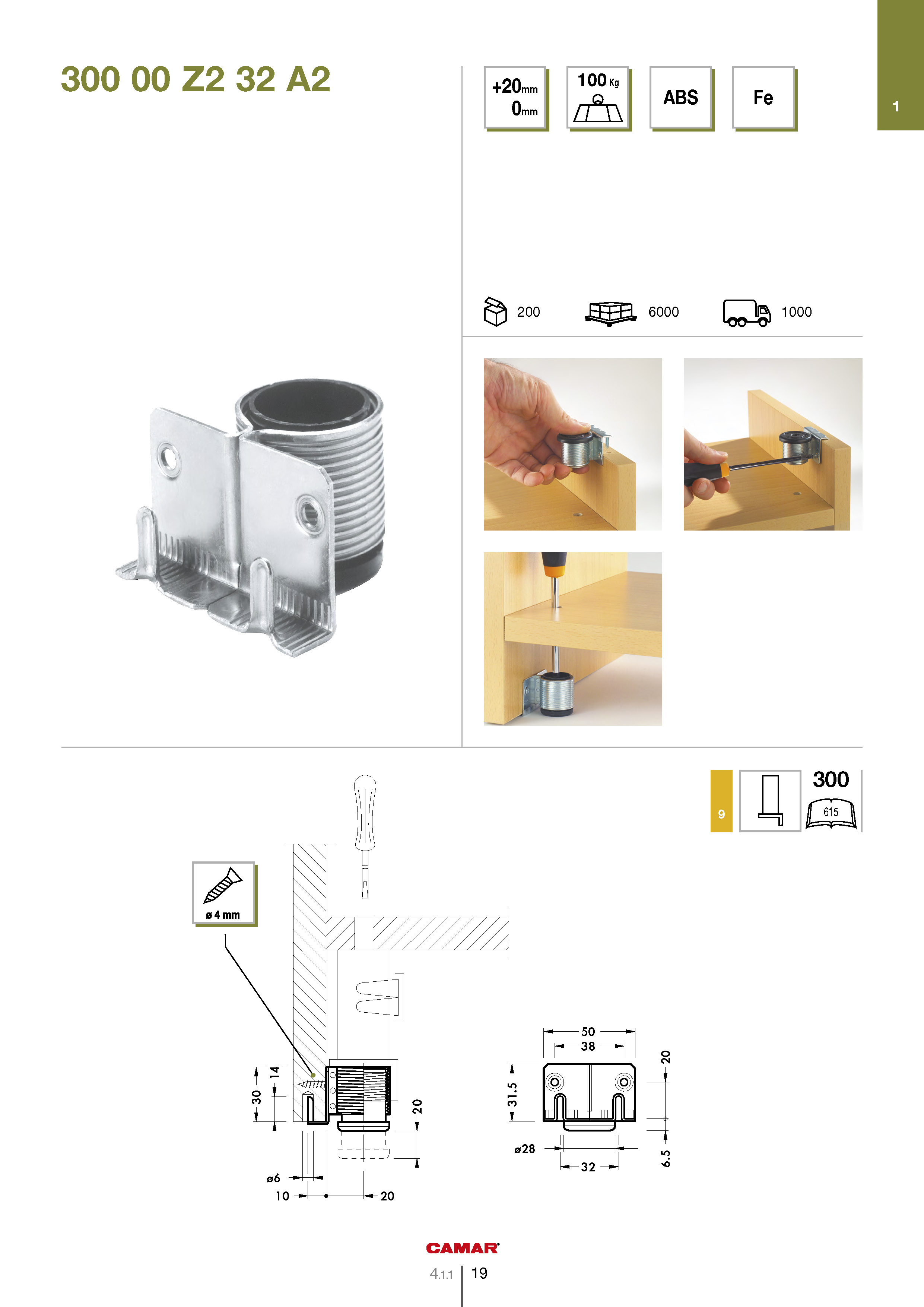 Опора регулируемая металлическая D38, H30 CAMAR (150 кг) - мебельная ножка для тяжелого шкафа, регулируемая по высоте. Диапазон регулировки - от 30 мм до 50 мм. Монтируется посредством забивания в торец мебельной боковины и дополнительно закрепляется двумя саморезами.