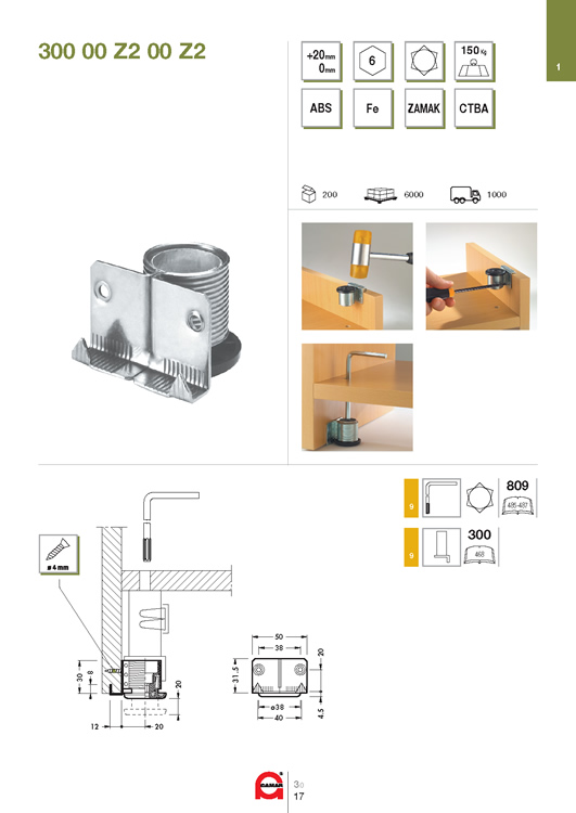 Опора регулируемая металлическая D38, H30 CAMAR (100 кг) - мебельная ножка для тяжелого шкафа, регулируемая по высоте. Диапазон регулировки - от 30 мм до 50 мм. Монтируется посредством забивания в торец мебельной боковины и дополнительно закрепляется двумя саморезами.