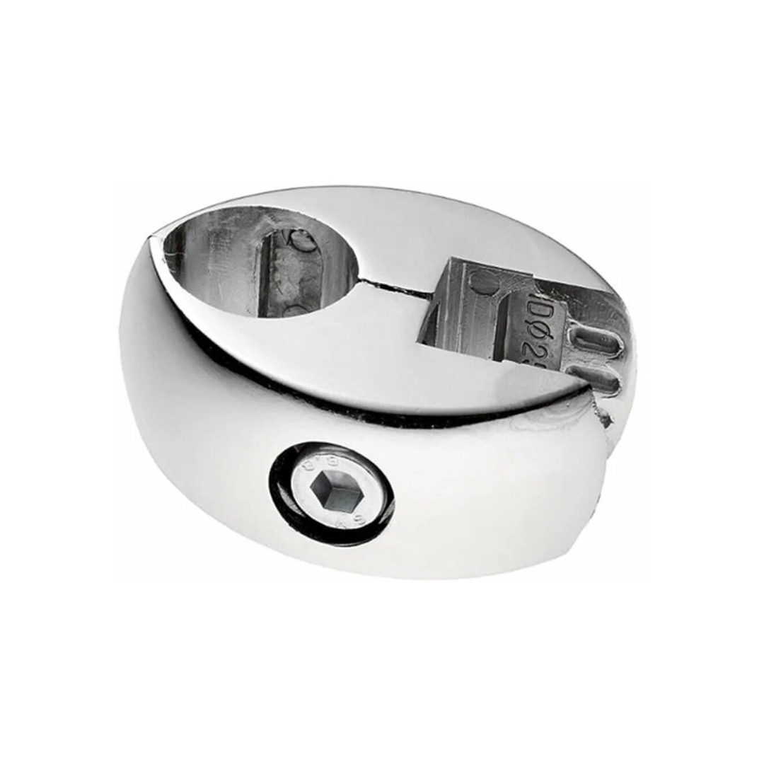 R7 Держатель (без вкладок) - крепежный элемент, используемый в качестве фиксатора полки из древесной плиты или стекла, при сборке торгового оборудования на основе труб диаметром 25 мм. Держатель предназначен для плиты толщиной 18 мм и стекла толщиной от 4 до 8 мм.