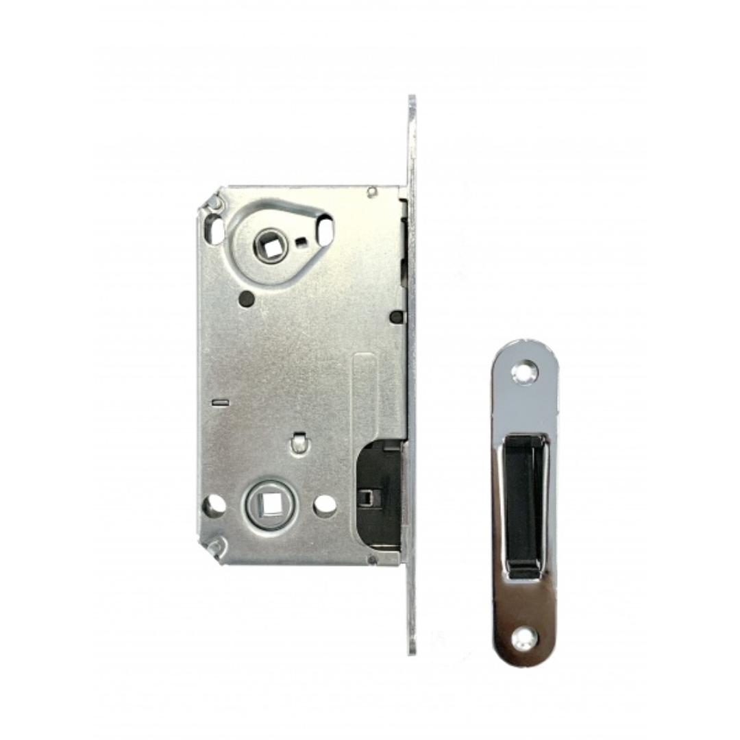 Врезной замок MCX9050 хром, размер корпуса 73х131 мм подойдет для установки с дверными ручками на розетке в комплекте с сантехническим фиксатором.