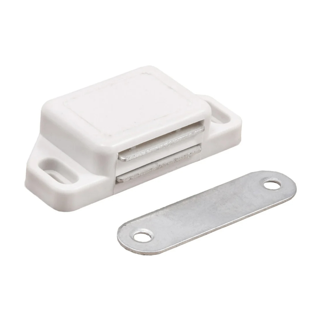 Защелка магнитная белая - приспособление, необходимое для предотвращения случайного открытия дверцы фасада. Магнитный фиксатор устанавливается на корпус мебели, а к внутренней стороне створки прикрепляется металлическая планка. Таким образом, дверца удерживается в закрытом состоянии за счет магнитного поля.